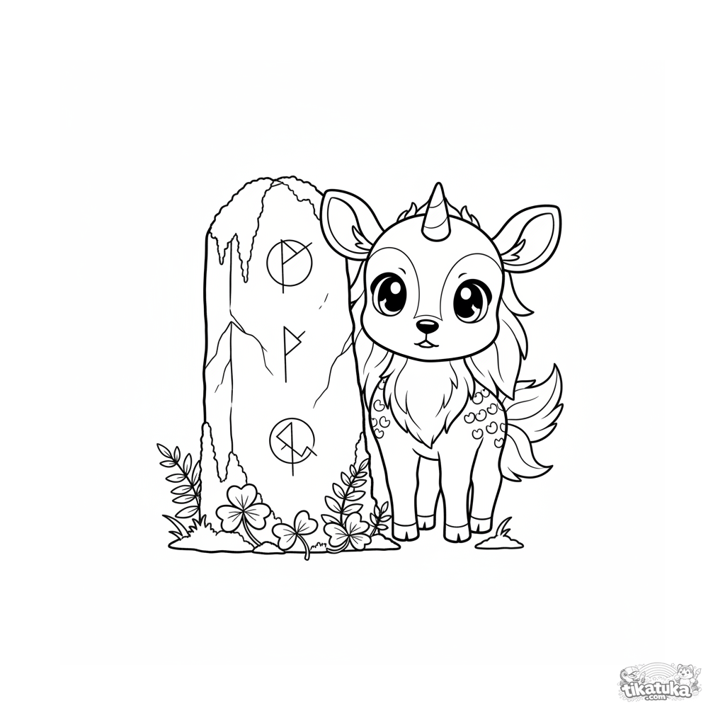 Página para colorear para niños de 4-6 años: un tímido ternero de kirin asoma la cabeza desde detrás de una enorme piedra rúnica musgosa. Sujeto principal claro, fondo simple, detalle moderado.