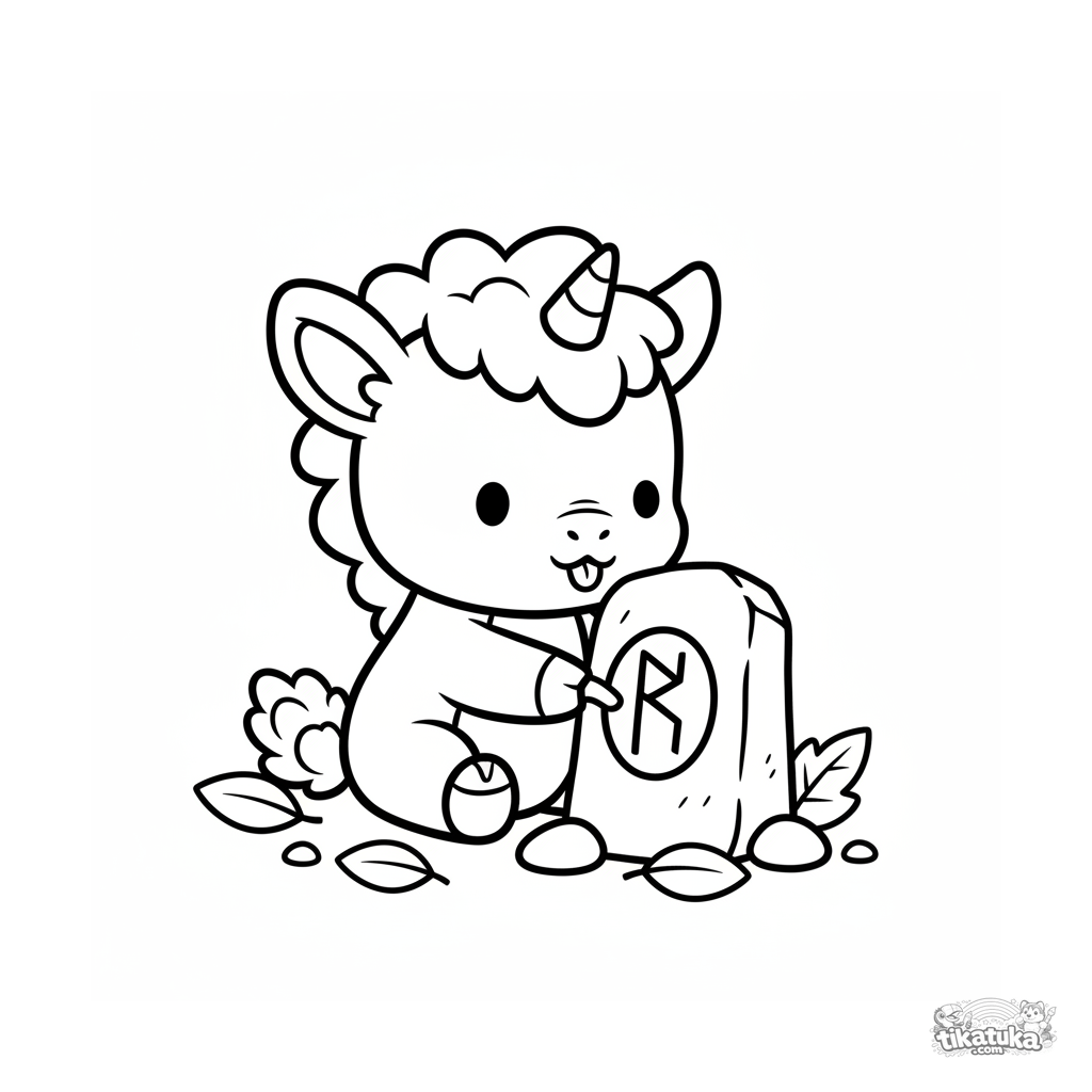Página simple para colorear para niños de 2-3 años: un cachorro de kirin sentado junto a una piedra rúnica.