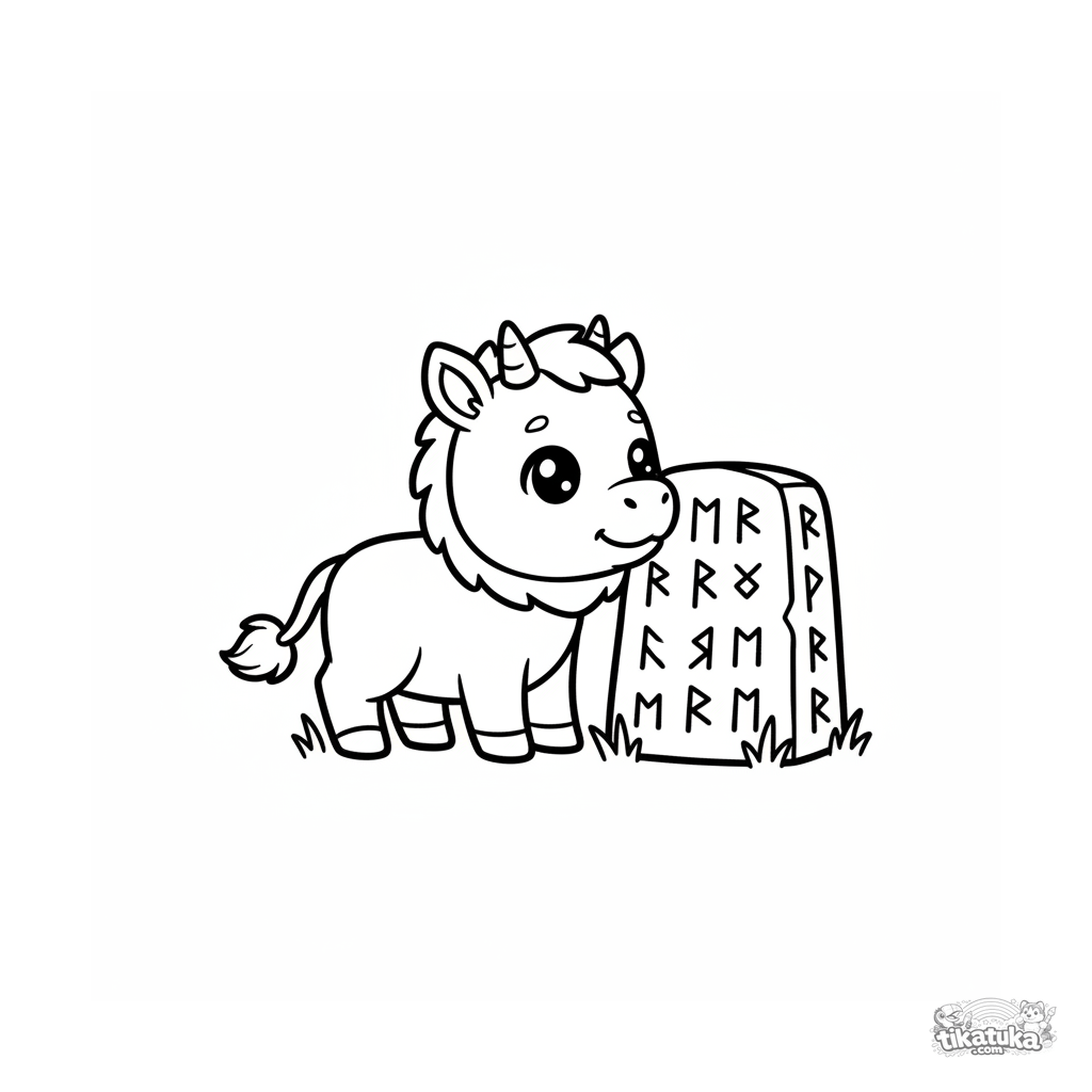 Página simple para colorear para niños pequeños de 2-3 años: un lindo potro de kirin está junto a una gran piedra rúnica. Formas grandes y claras, márgenes amplios para primeros crayones.