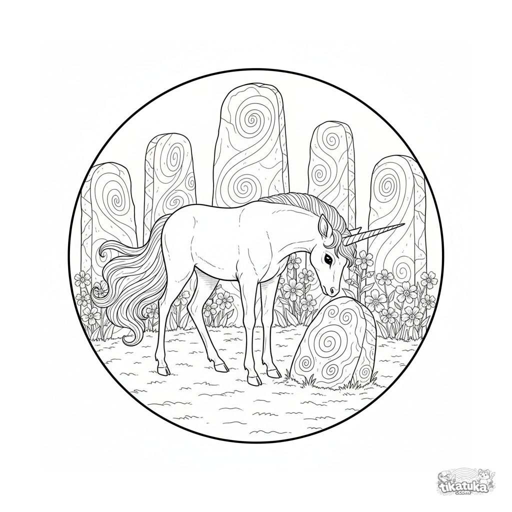 Página para colorear para niños 10-12: un noble kirin en un círculo de monolitos antiguos acaricia suavemente una piedra rúnica caída. Líneas detalladas, estilo naturalista.