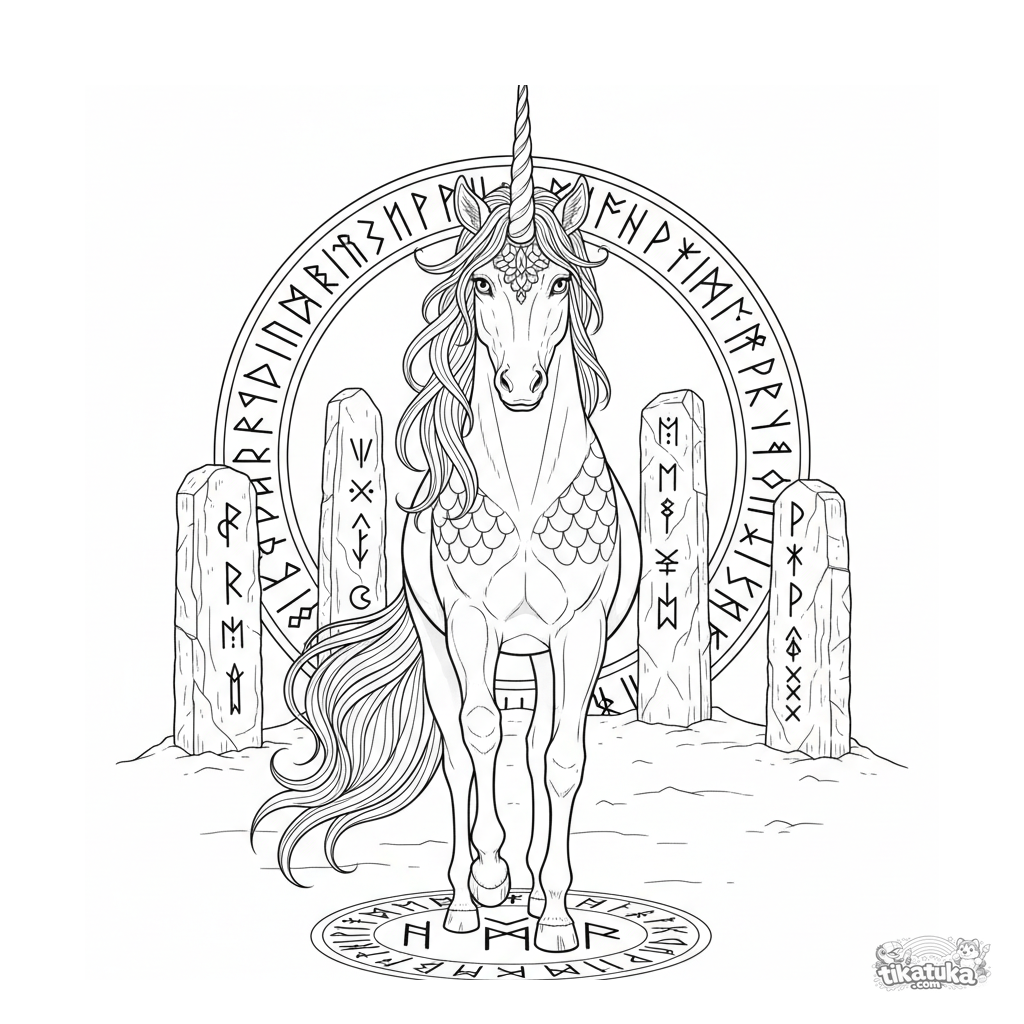 Página para colorear intrincada para 10-12 años: un majestuoso kirin custodia un círculo de antiguos monolitos rúnicos. Escamas, melena y runas talladas detalladas.