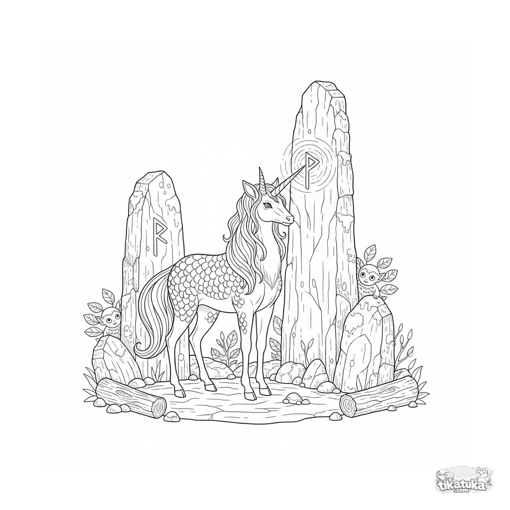 Página para colorear compleja para niños de 10-12 años: un majestuoso kirin, criatura mítica, activando runas en un antiguo menhir. Trazos detallados, tema educativo.