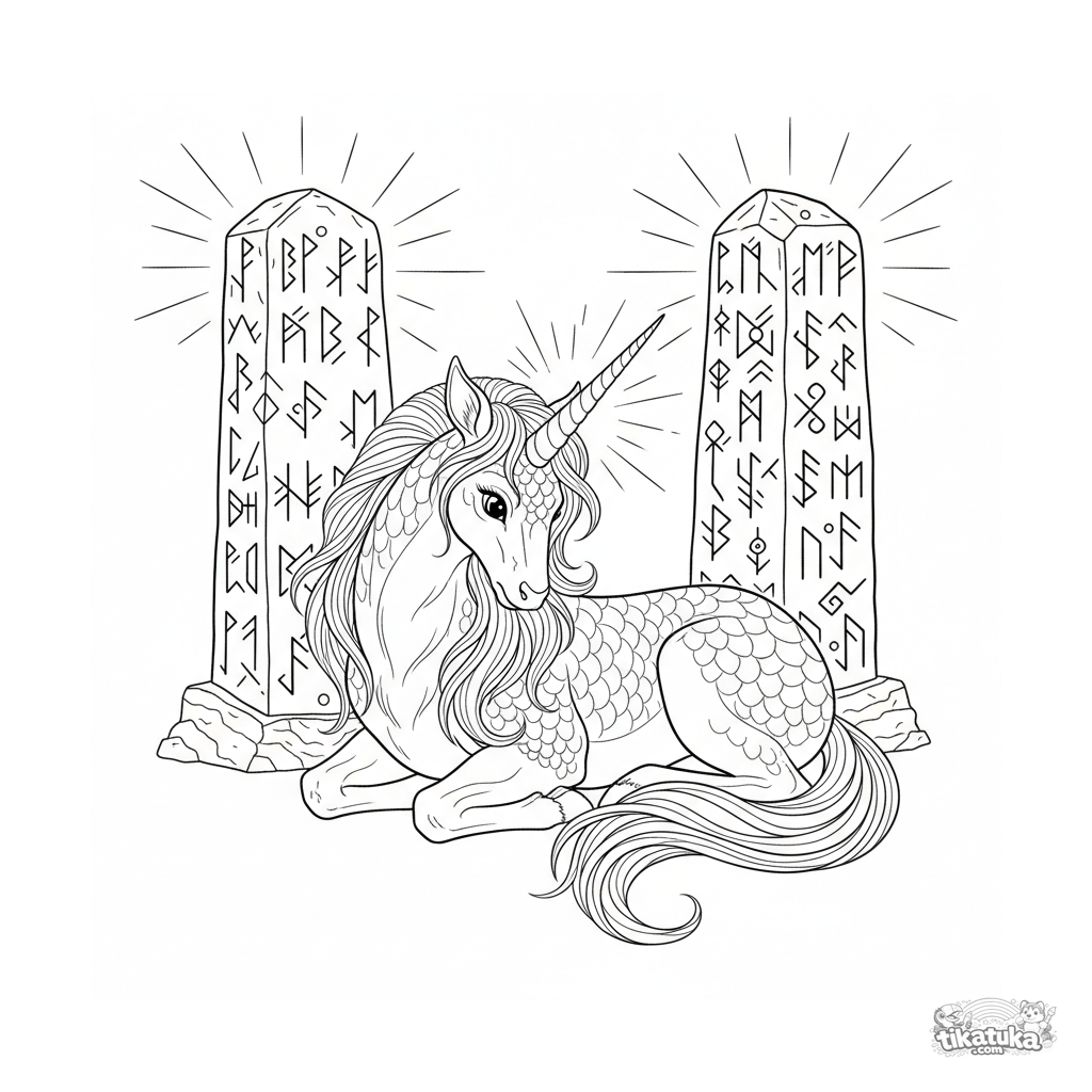 Página para colorear compleja para niños mayores de 10 a 12 años: un kirin mítico medita entre monolitos rúnicos. Alto nivel de detalle, texturas, fondo.