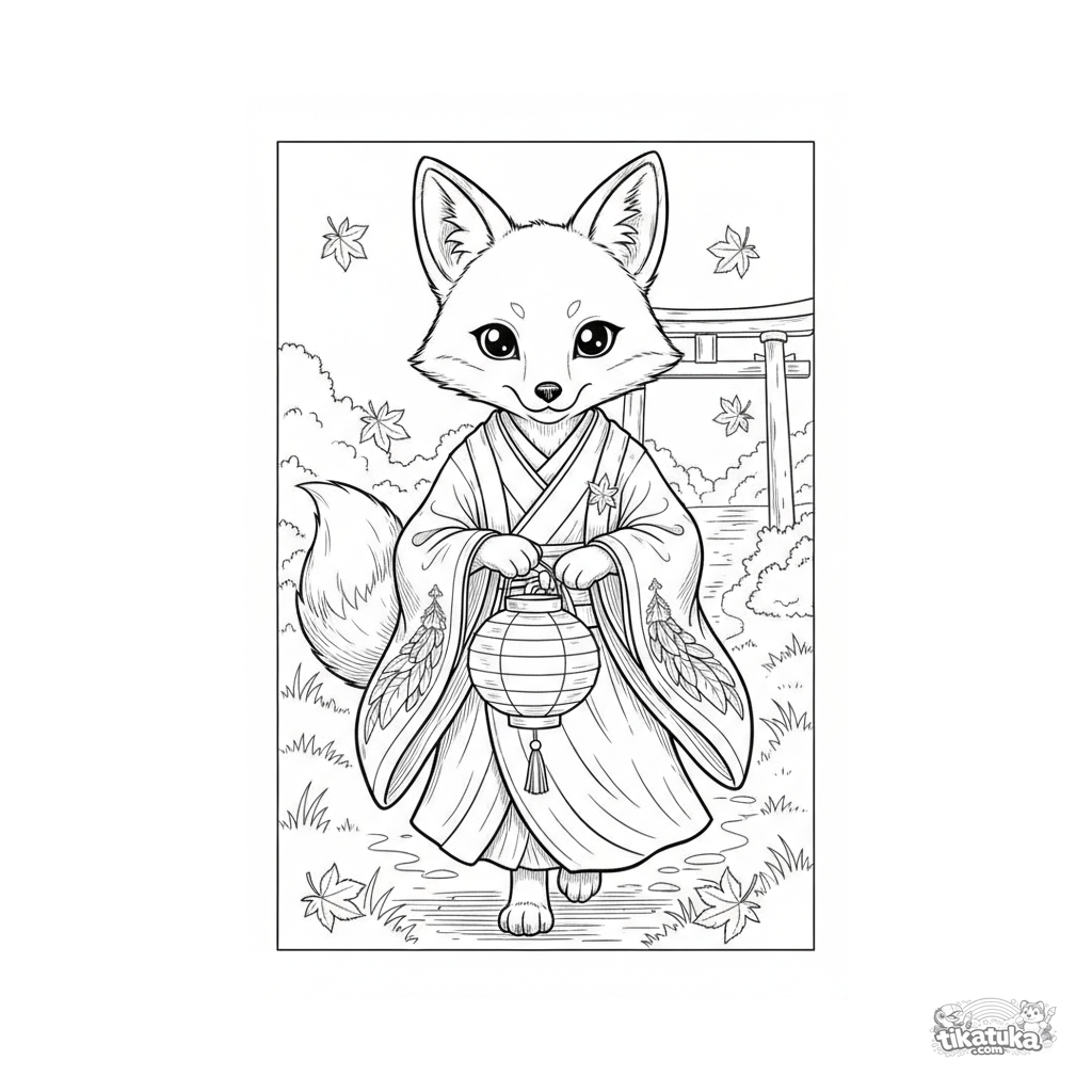 Página para colorear para niños: un espíritu zorro kitsune en un kimono de festival lleva una linterna de papel por un sendero del bosque.