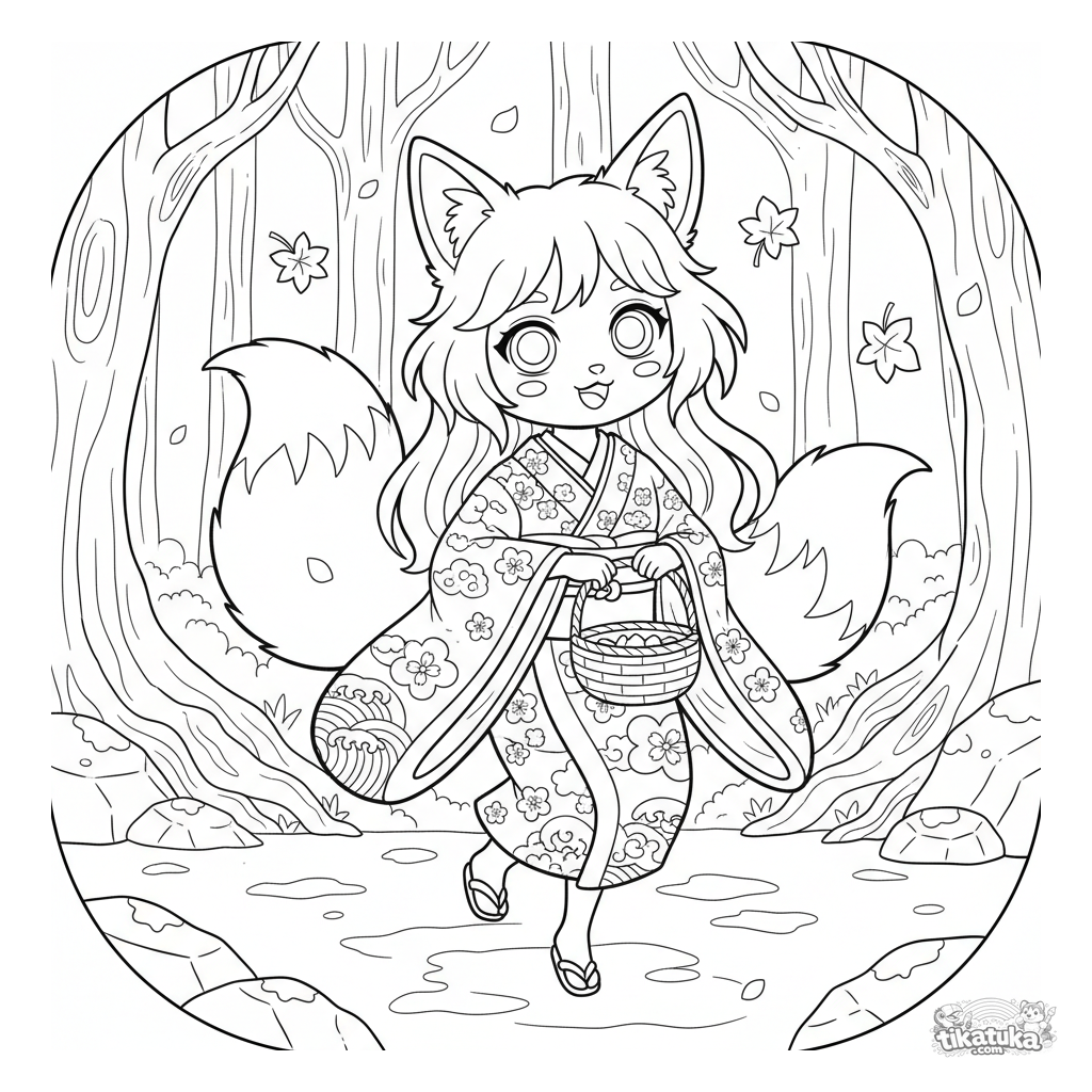 Detallada página para colorear estilo anime para 10-12 años: un espíritu kitsune con dos colas en kimono recoge alegremente hojas de otoño en una cesta en un claro del bosque mágico.