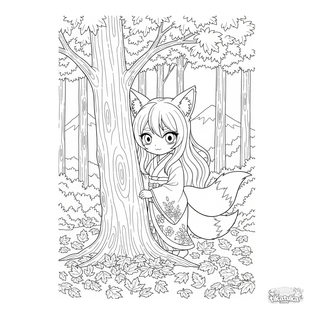 Página para colorear estilo anime: una chica espíritu kitsune con orejas y cola de zorro se asoma tras un arce en un bosque otoñal. Para 10-12 años con fondo detallado.