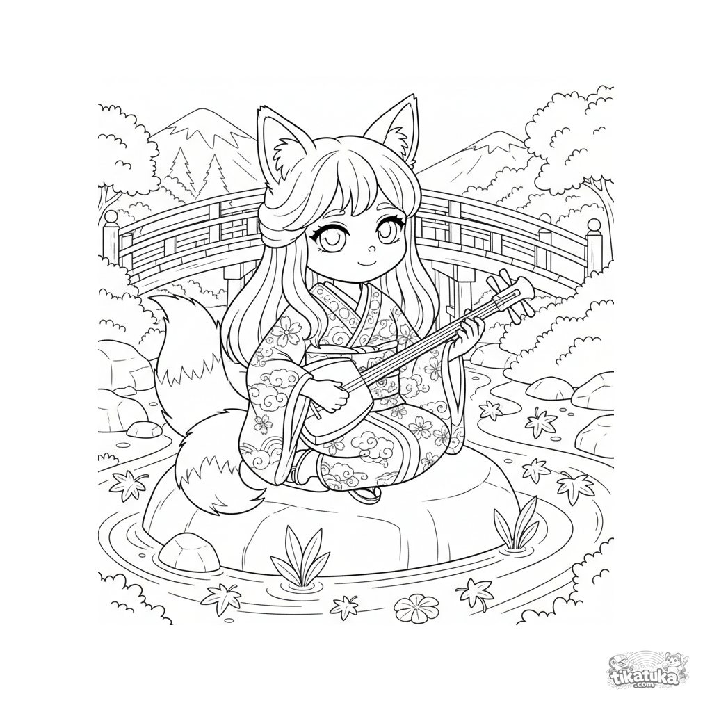 Detallada página para colorear anime: una chica zorro kitsune toca un shamisen tradicional junto a un río otoñal. Para niños de 10-12 años.