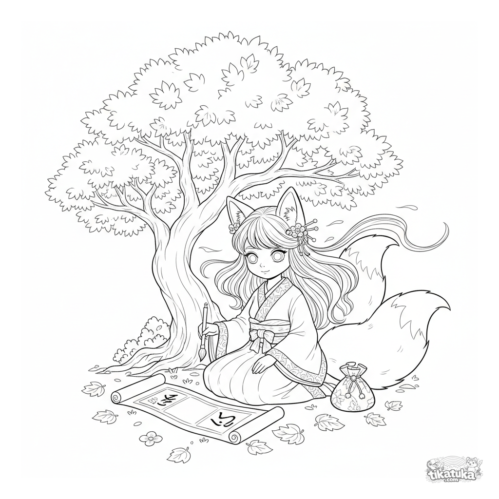 Página para colorear estilo anime: una chica espíritu zorro practica caligrafía bajo un arce otoñal. Escena detallada para 10-12 años con fondo intrincado.