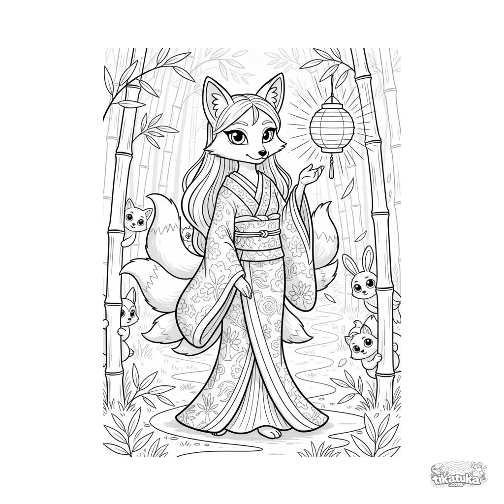 Página para colorear anime: un espíritu kitsune con linterna guía a través de un bosque de bambú otoñal. Escena detallada y atmosférica para 10-12 años.