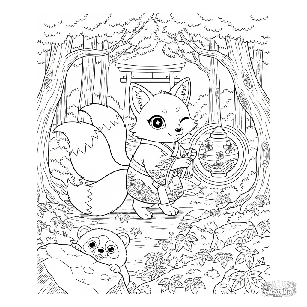 Página para colorear anime: un espíritu kitsune con un farol guía por un sendero misterioso en un bosque otoñal. Escena compleja y en capas con árboles, hojas y otros espíritus detallados para 10-12 años.