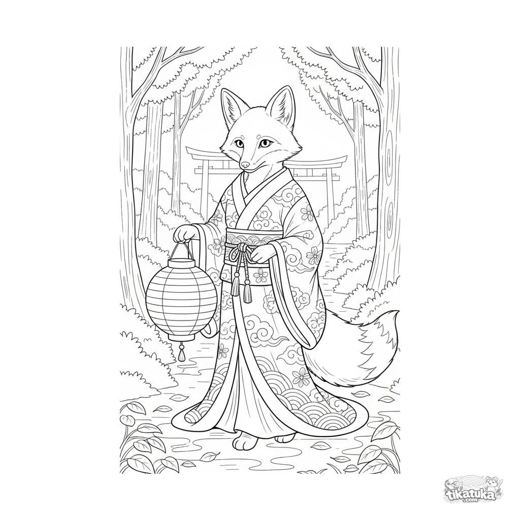 Página para colorear para niños mayores: un espíritu zorro kitsune en una túnica de festival lleva una linterna de papel por un sendero del bosque. Escena detallada del folclore japonés.