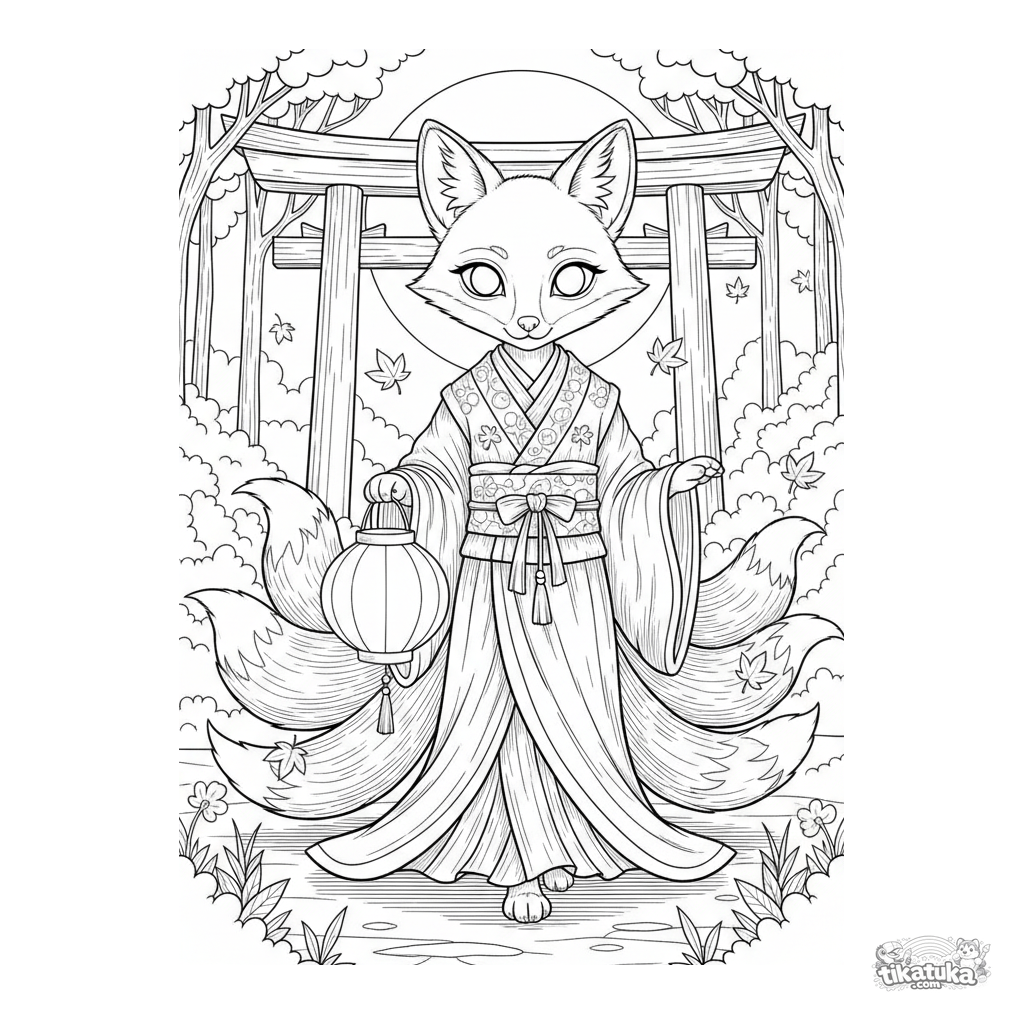 Página para colorear para niños mayores: un espíritu zorro kitsune con ropaje lleva una linterna de papel por un sendero del bosque. Escena detallada del folclore japonés con hojas de arce.