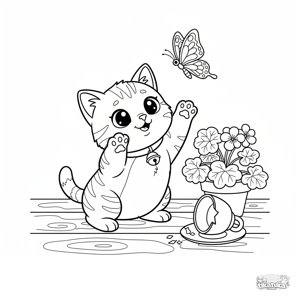 Página para colorear para niños 4-6: un gatito curioso juega con una mariposa en una terraza de verano entre flores.