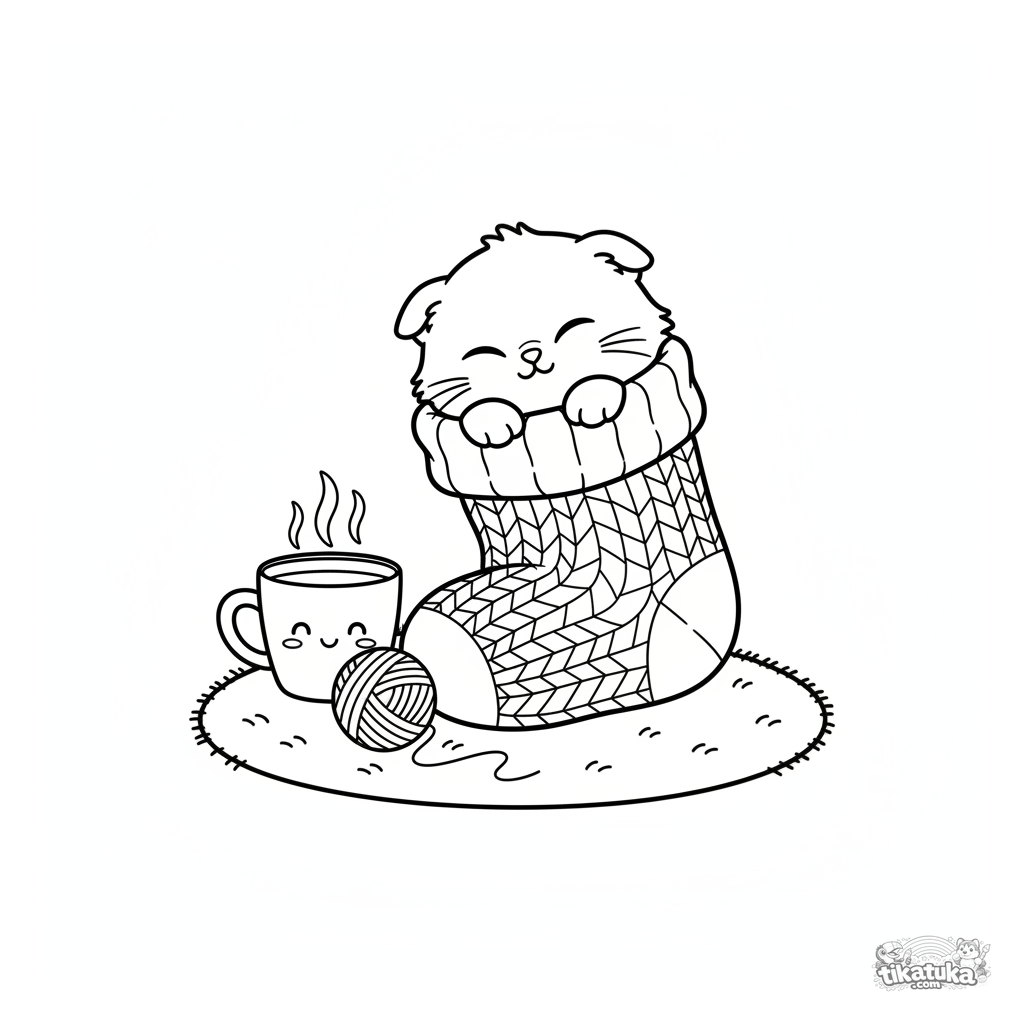 Página para colorear simple para niños pequeños de 2-3 años: un gatito esponjoso profundamente dormido, acurrucado en un calcetín de punto grande, con una taza cerca.