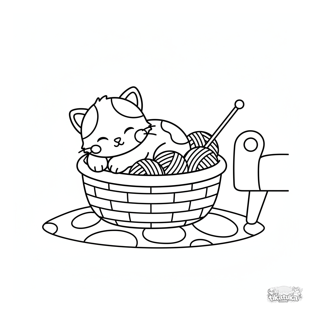 Página simple para colorear para niños pequeños 2-3: un gatito esponjoso duerme en una cesta de tejer con ovillos de hilo. Formas grandes.
