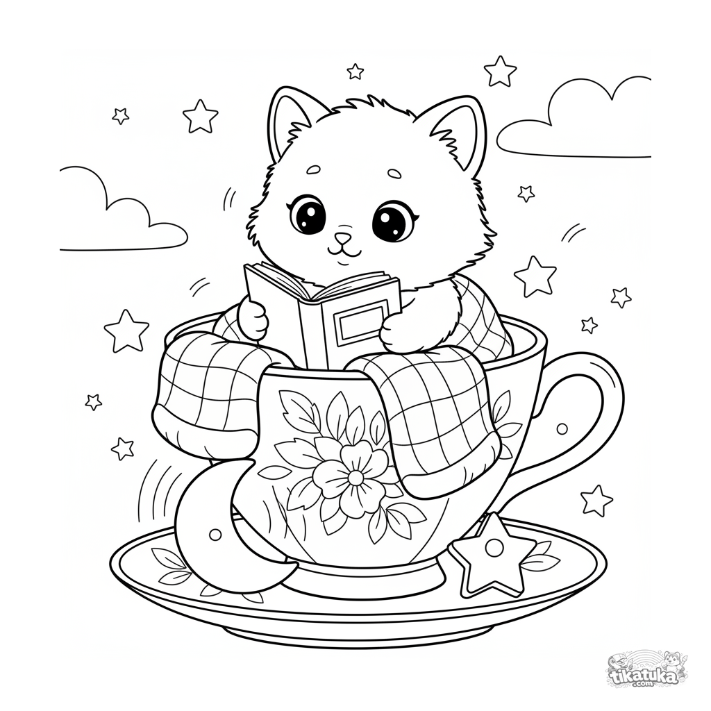 Página para colorear para niños 4-6 años: un gatito acogedor lee un libro dentro de una taza de té gigante a la luz de la luna. Escena linda y tranquila.