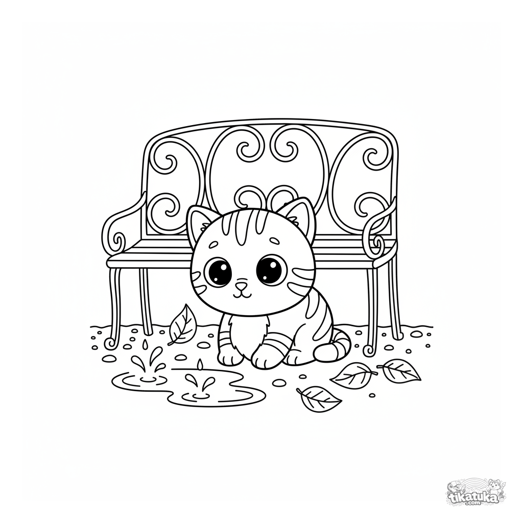 Página para colorear para niños de 4-6 años: un pequeño gatito a rayas se refugia de una lluvia otoñal bajo un banco de jardín. Formas claras y legibles, fondo moderado.