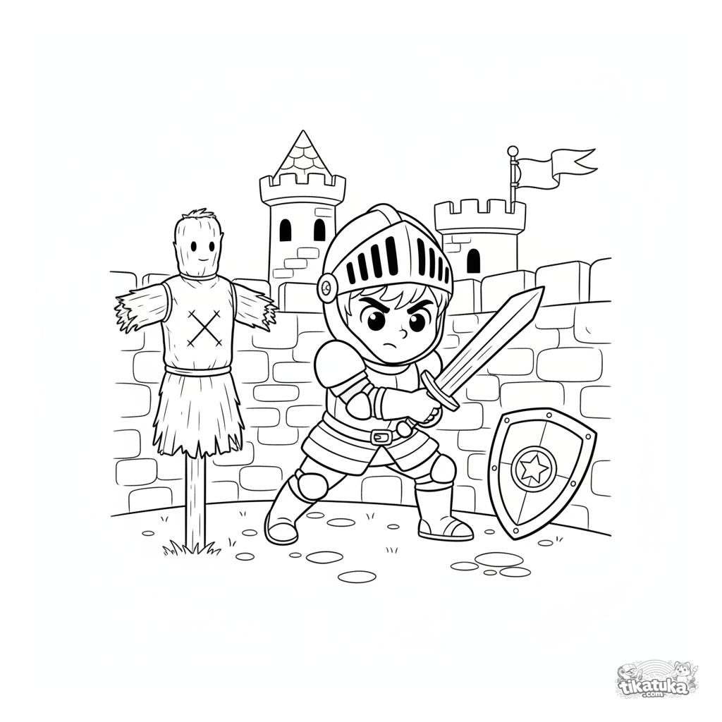Página para colorear para niños: un joven caballero con armadura practica con una espada de madera en un maniquí de paja. Para 5-7 años.
