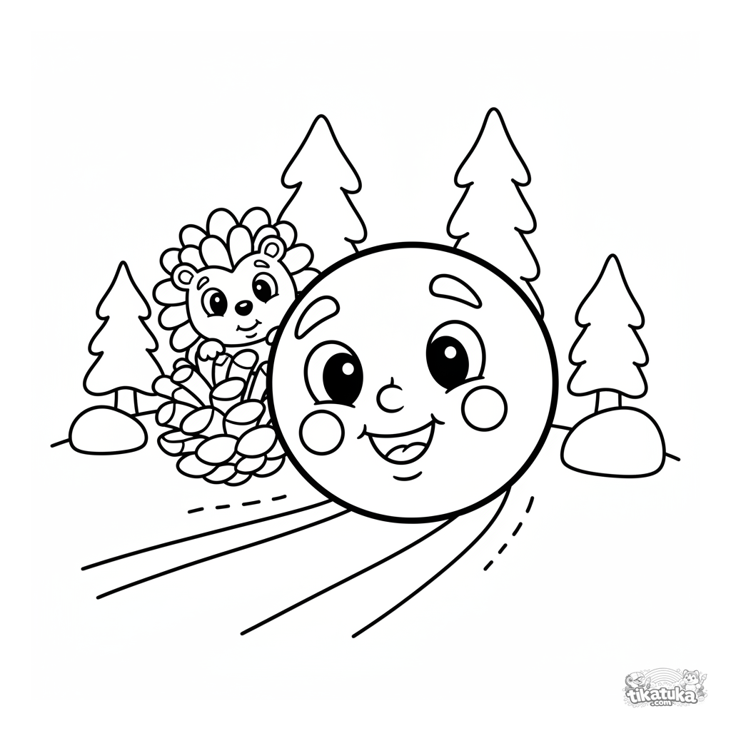 Página para colorear para niños pequeños de 2-3 años: Kolobok del cuento ruso rueda alegremente por un sendero del bosque junto a un erizo. Formas muy simples y grandes.