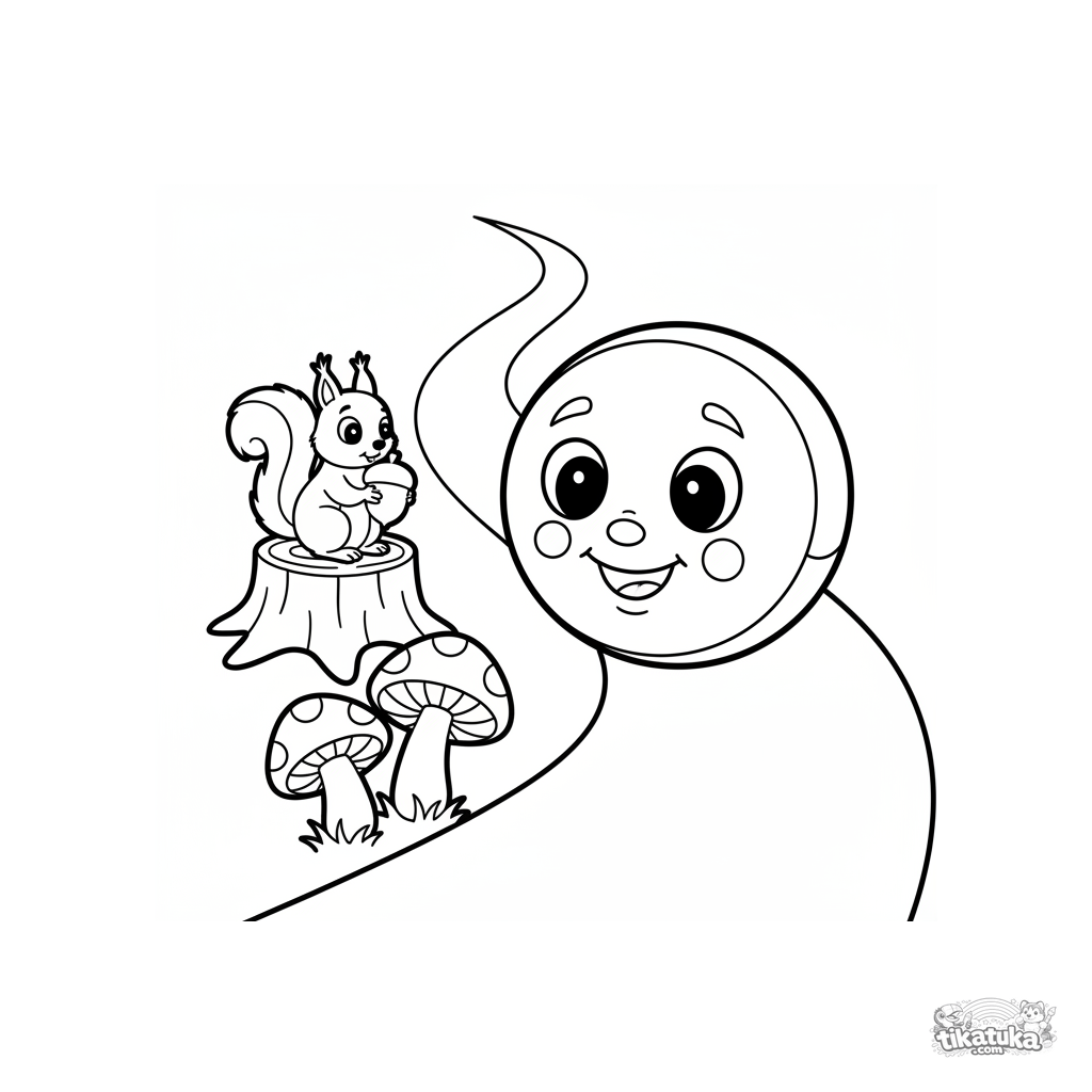 Página para colorear para niños pequeños 2-3 años: Kolobok del cuento ruso rueda por un sendero del bosque pasando una ardilla. Formas muy simples, grandes, contornos gruesos.