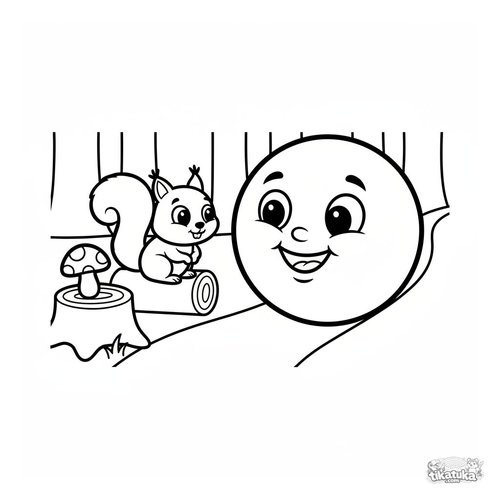 Página para colorear simple para niños pequeños de 2-3 años con Kolobok rodando felizmente por un sendero del bosque pasando una ardilla. Formas grandes y contornos claros.