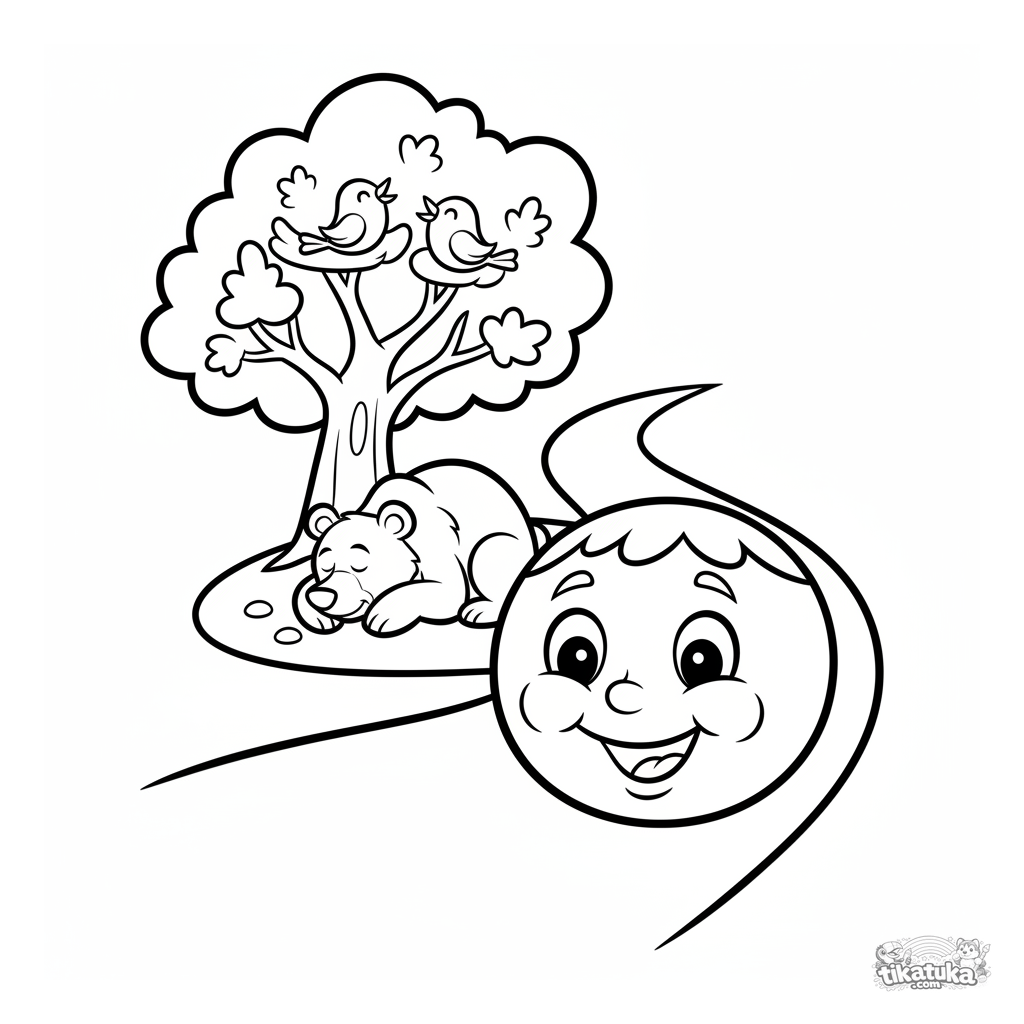 Página simple para colorear para niños pequeños de 2-3 años con Kolobok del cuento. Kolobok rueda por un sendero pasando un oso dormido. Formas grandes y simples.