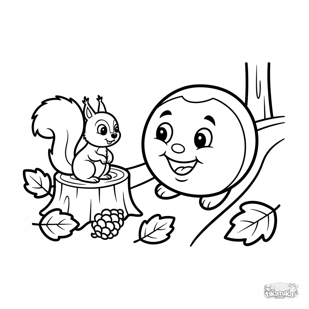 Página para colorear para niños pequeños 2-3 años: Kolobok rueda feliz por un sendero del bosque y conoce a una ardilla. Formas muy simples, detalles grandes.