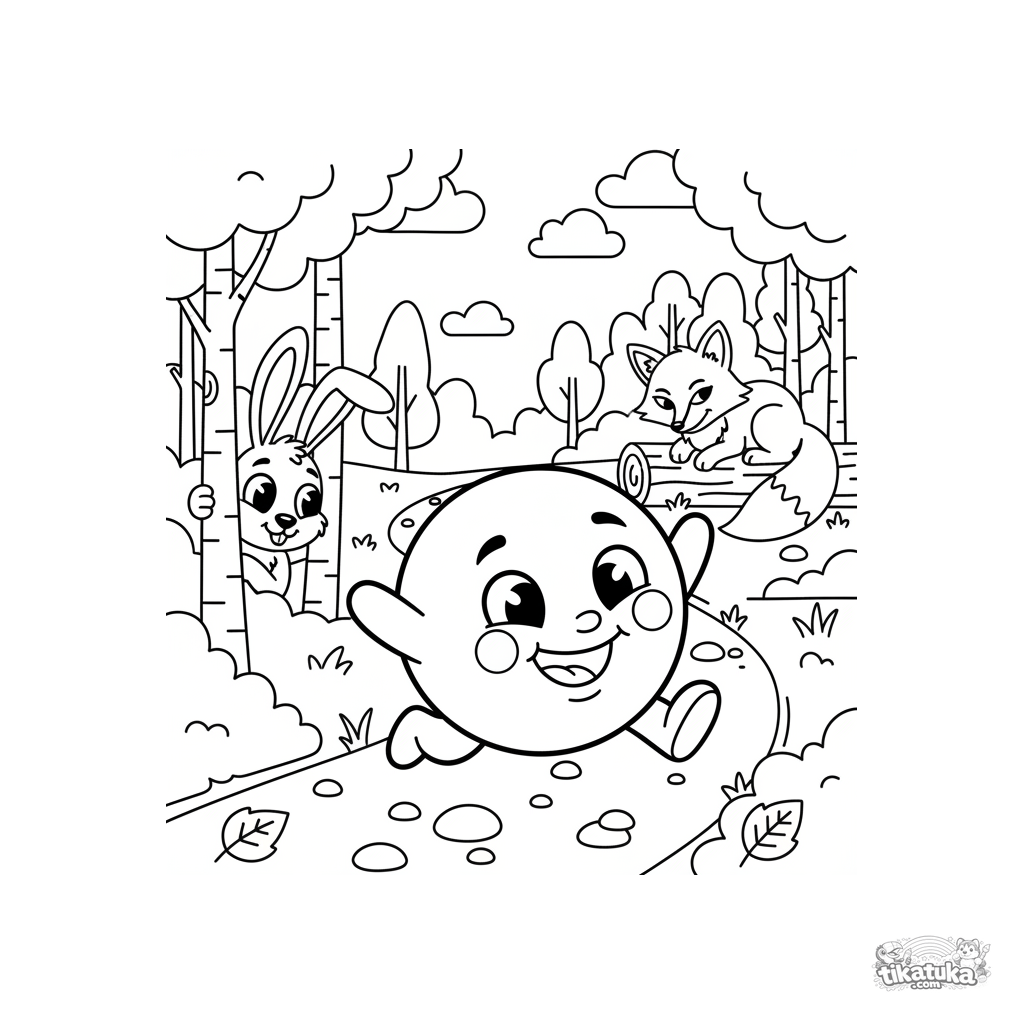 Página para colorear basada en un cuento ruso para niños de 4-6 años: el alegre Kolobok rueda por un sendero del bosque, observado por una liebre y un zorro. Una escena familiar y amable para desarrollar la imaginación.