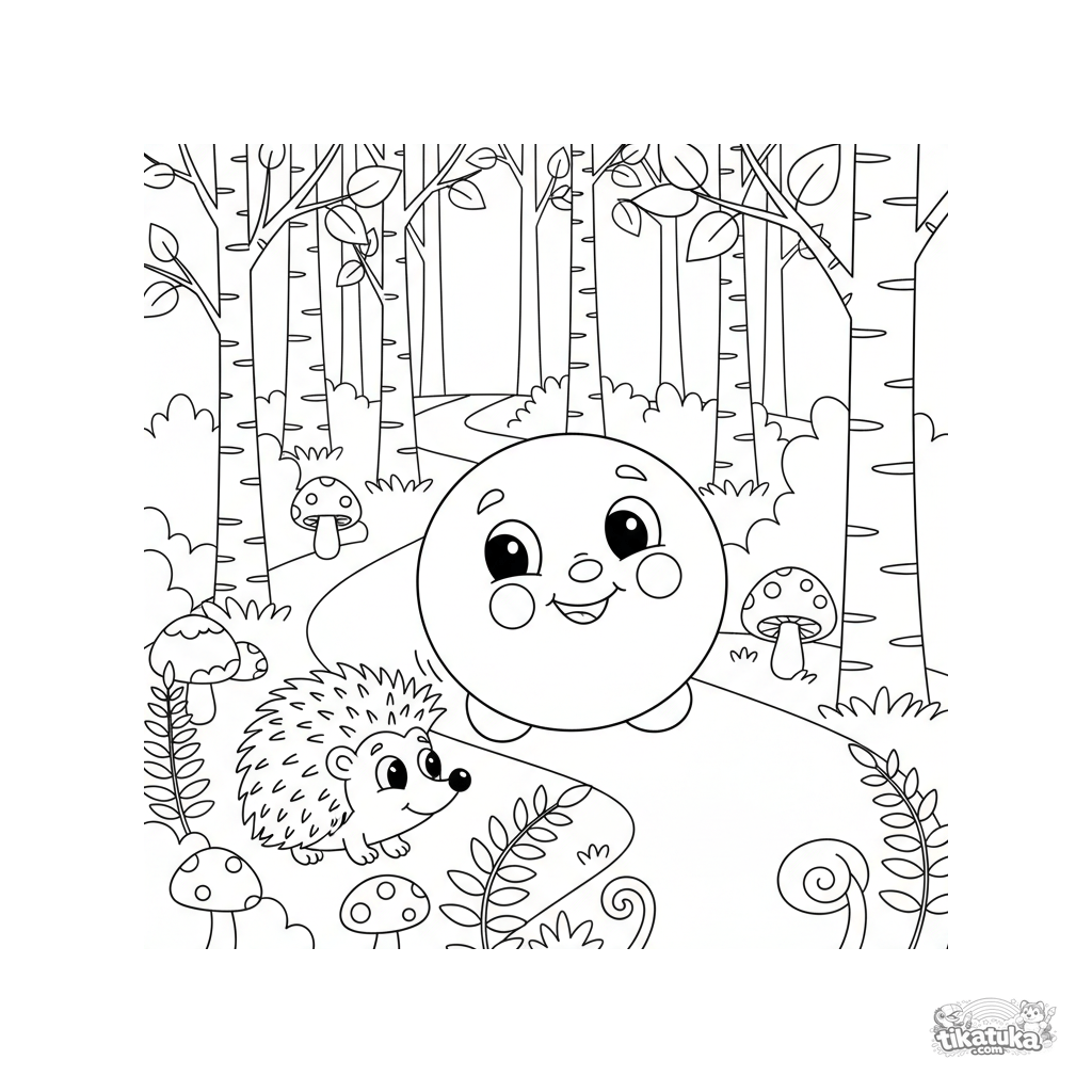 Página para colorear del cuento ruso: Kolobok rodando feliz por un sendero del bosque junto a un erizo. Para niños de 4 a 6 años.