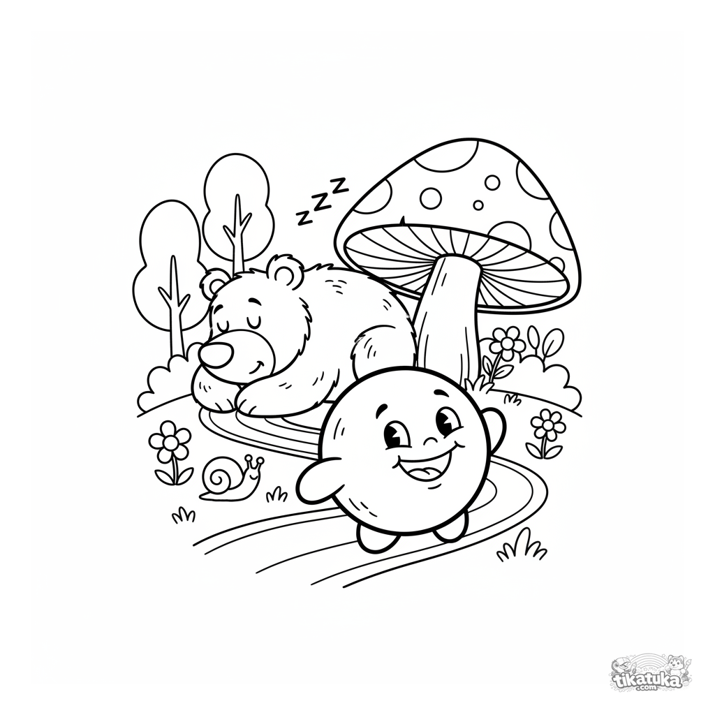 Página para colorear para niños pequeños de 2-3 años: Kolobok rueda por el bosque junto a un oso dormido. Formas muy simples y grandes, perfecto para los más pequeños.