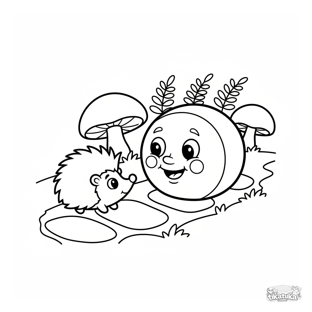 Página para colorear para niños pequeños 2-3 años: el alegre Kolobok del cuento rueda por un sendero del bosque junto a un erizo curioso.