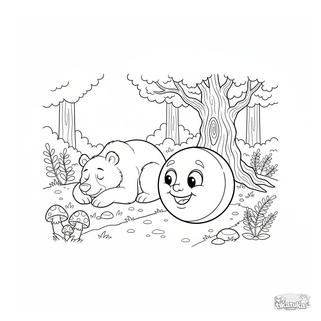 Página para colorear de un cuento ruso: Kolobok rodando por el bosque pasando un oso dormido. Para niños de 4 a 6 años.