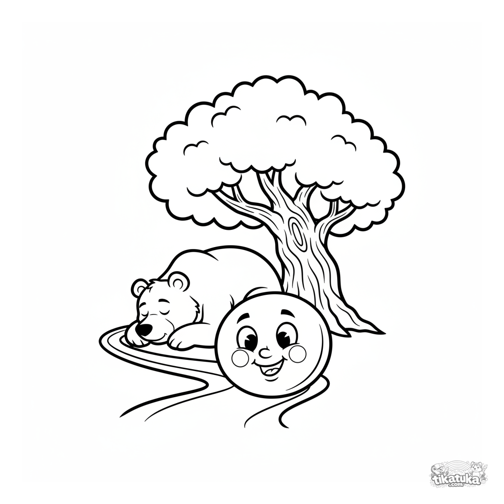 Página simple para colorear para niños pequeños 2-3: Kolobok rodando por un sendero del bosque pasando un oso dormido. Formas grandes, pocos detalles.