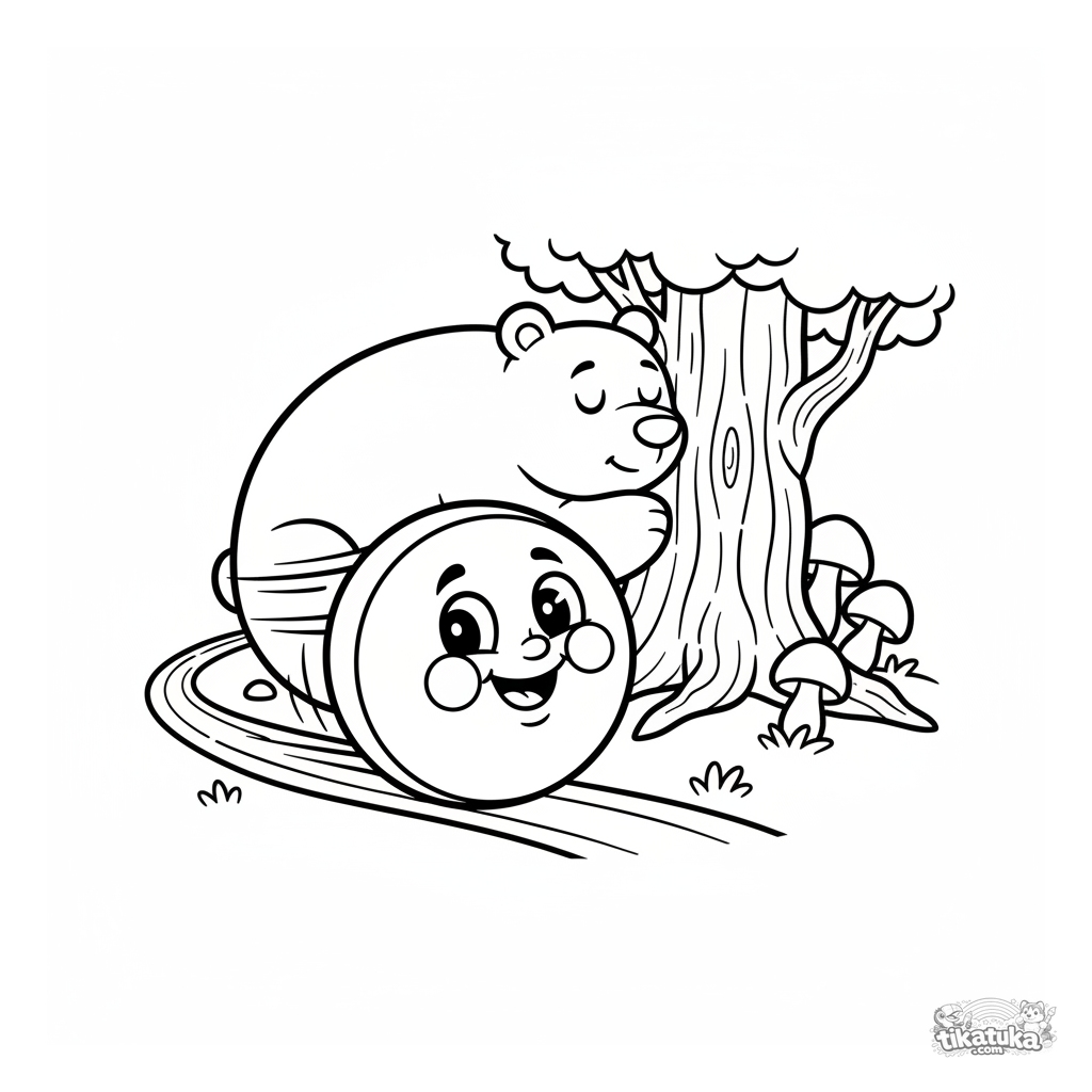 Página simple para colorear de un cuento ruso: Kolobok rueda junto a un oso dormido. Formas grandes, pocos detalles.