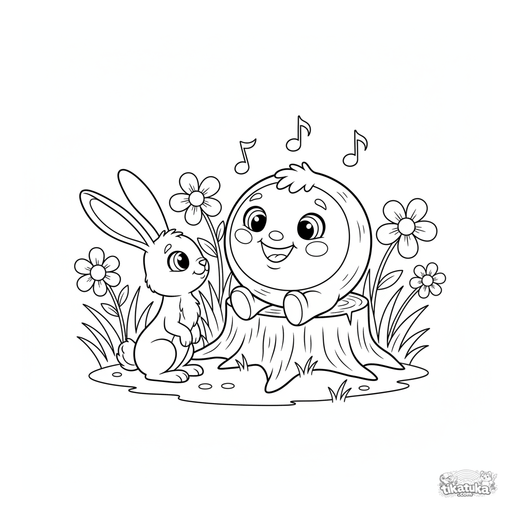 Página simple para colorear para bebés: Kolobok cantando su canción a la Liebre en un tocón. Formas grandes, pocos detalles, perfecto para niños de 2-3 años.
