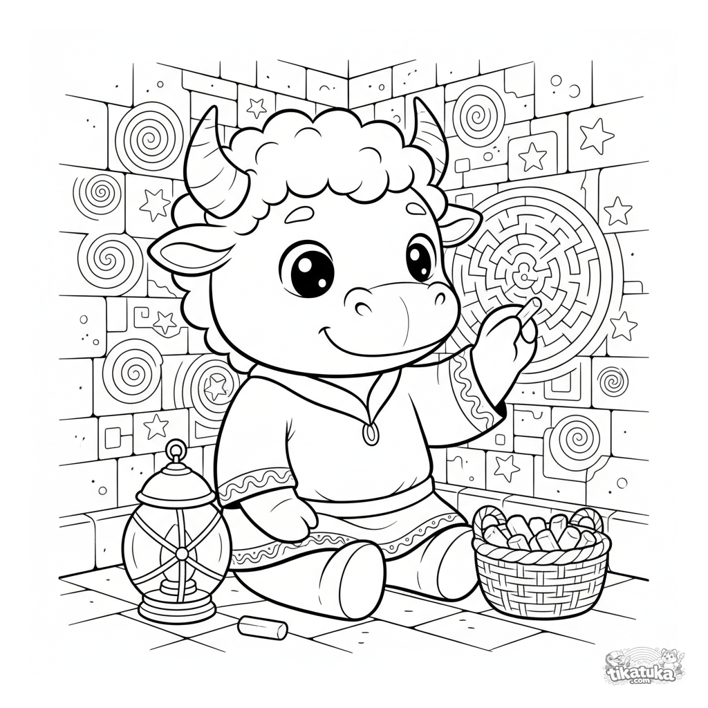 Página para colorear para niños de 7-12 años: un minotauro artista amable dibuja con tiza en las paredes de una gran sala de laberinto. Escena detallada estilo cómic-aventura.