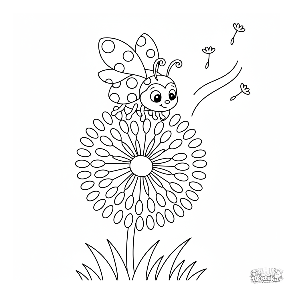Página simple para colorear para niños pequeños de 2-3 años con una mariquita. Formas grandes y claras del insecto en un diente de león.