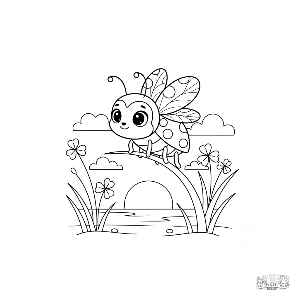 Página para colorear para niños: una mariquita se equilibra en una brizna de hierba al atardecer. Contornos claros y detalle moderado.