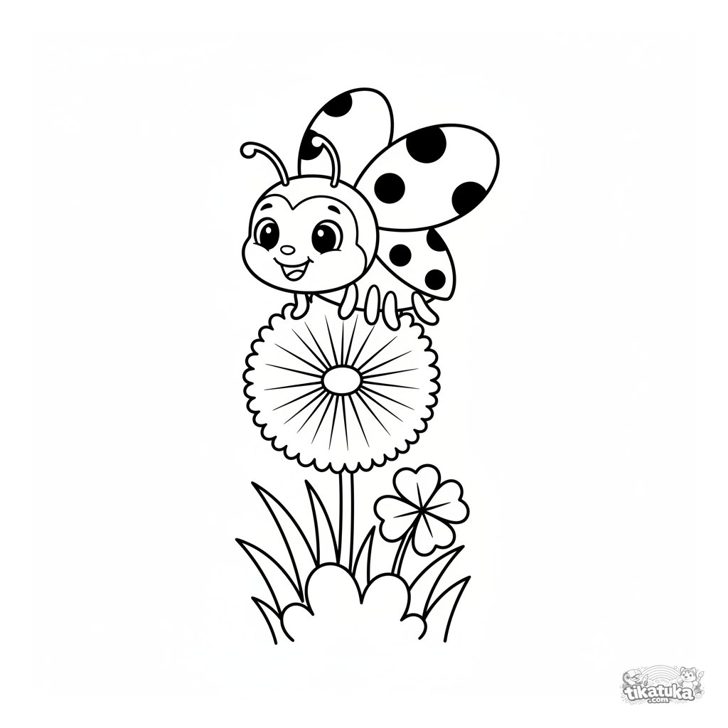 Página para colorear para niños pequeños de 2-3 años: una mariquita simple se equilibra en un diente de león esponjoso. Formas grandes, pocos detalles, ideal para los más pequeños.