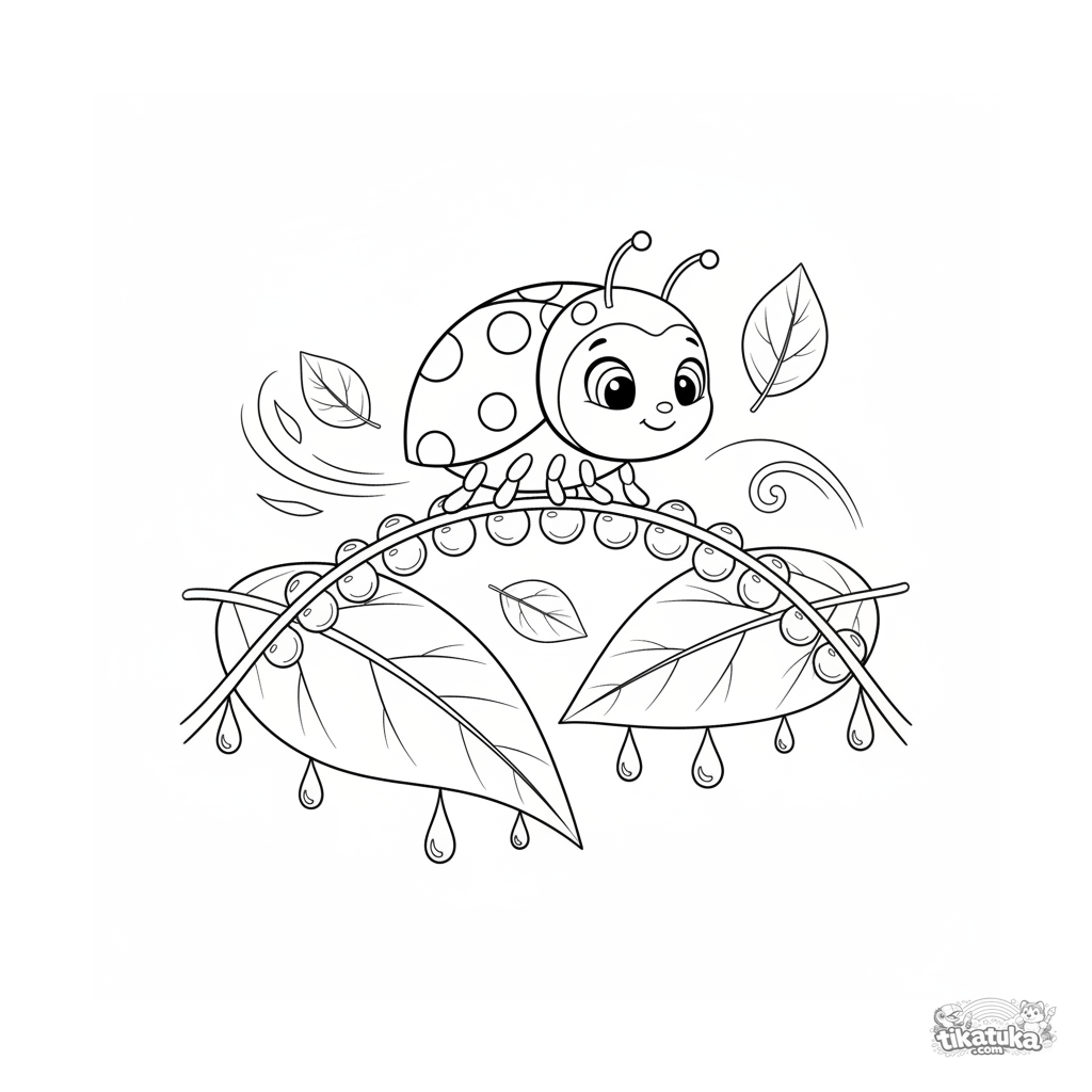 Página para colorear para niños 4-6: una mariquita camina por un frágil puente de gotas de rocío en una hoja grande. Escena tierna con detalles.