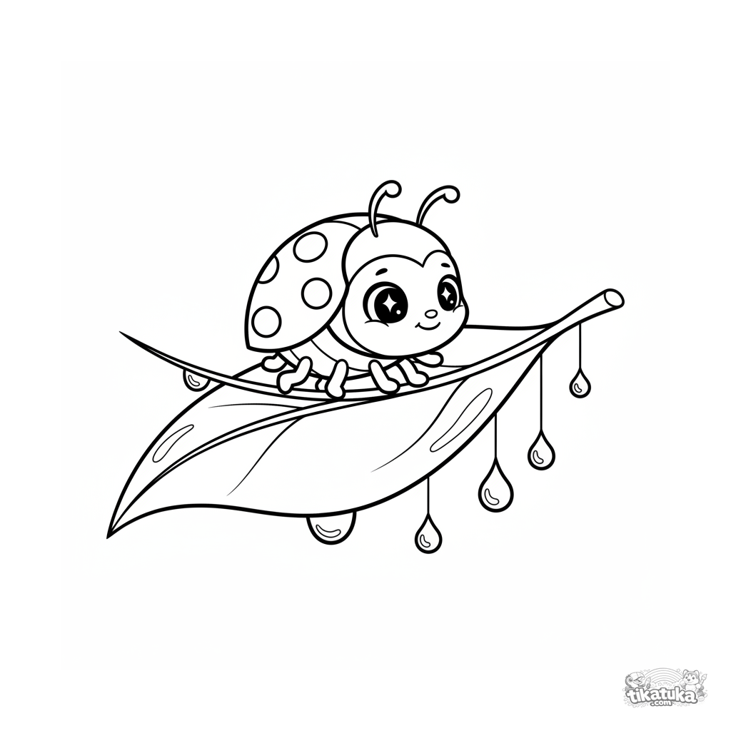 Página para colorear simple para niños pequeños de 2-3 años: una linda mariquita se equilibra en una cuerda de rocío sobre una hoja grande. Formas grandes y claras.