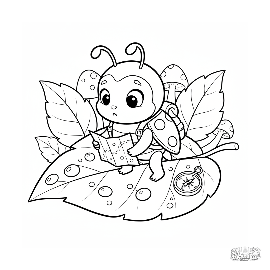 Página para colorear para niños 4-6: una mariquita cartógrafa estudia un mapa en una hoja grande con gotas de rocío. Escena linda.