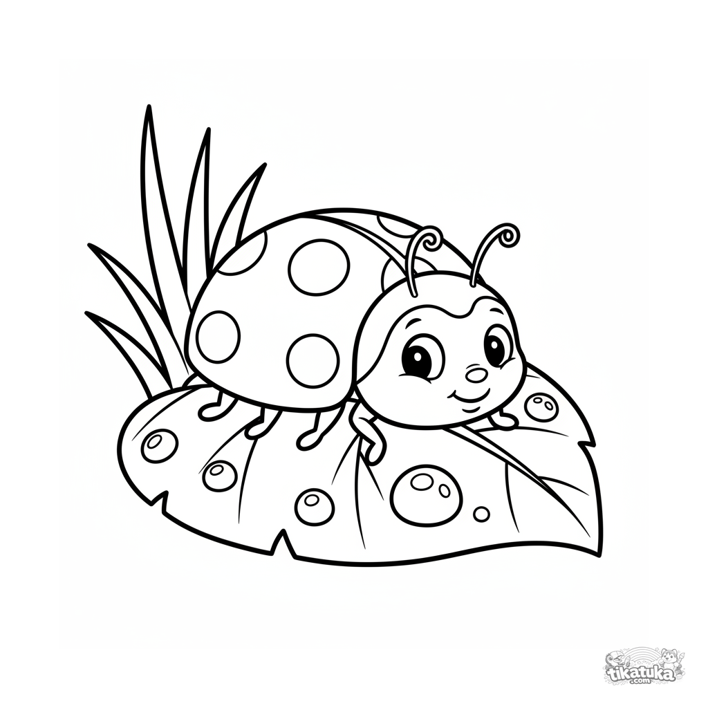 Página para colorear para niños pequeños: una mariquita se arrastra por una gran hoja verde con gotas de rocío.
