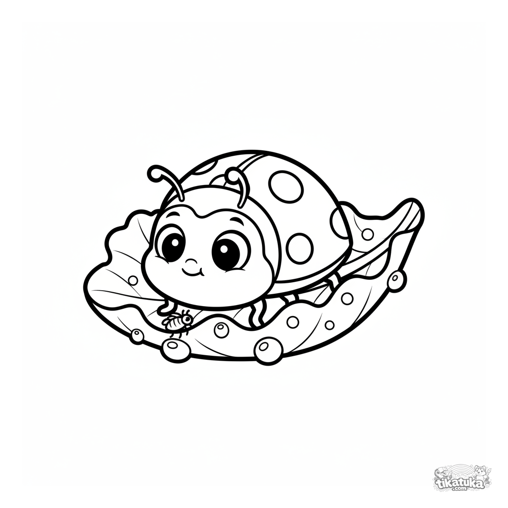Página para colorear para niños pequeños 2-3: una mariquita regordeta en una hoja rizada de lechuga en un jardín, mirando a un pequeño pulgón. Formas simples, detalles grandes.