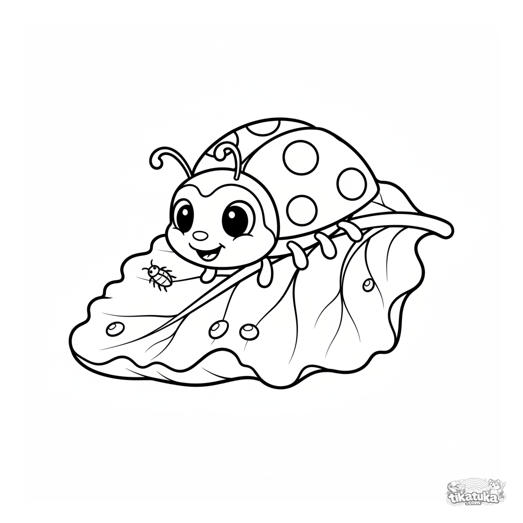 Página simple para colorear para niños pequeños de 2-3 años con una mariquita. La mariquita se arrastra por una gran hoja rizada en un huerto.