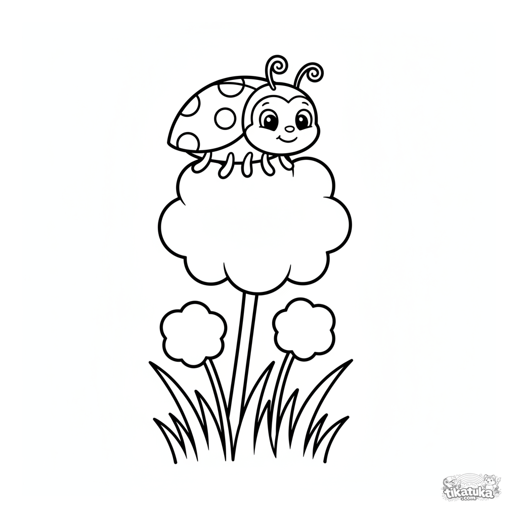 Página para colorear simple para niños pequeños de 2-3 años con una mariquita. La mariquita se balancea en un diente de león esponjoso en un prado soleado.