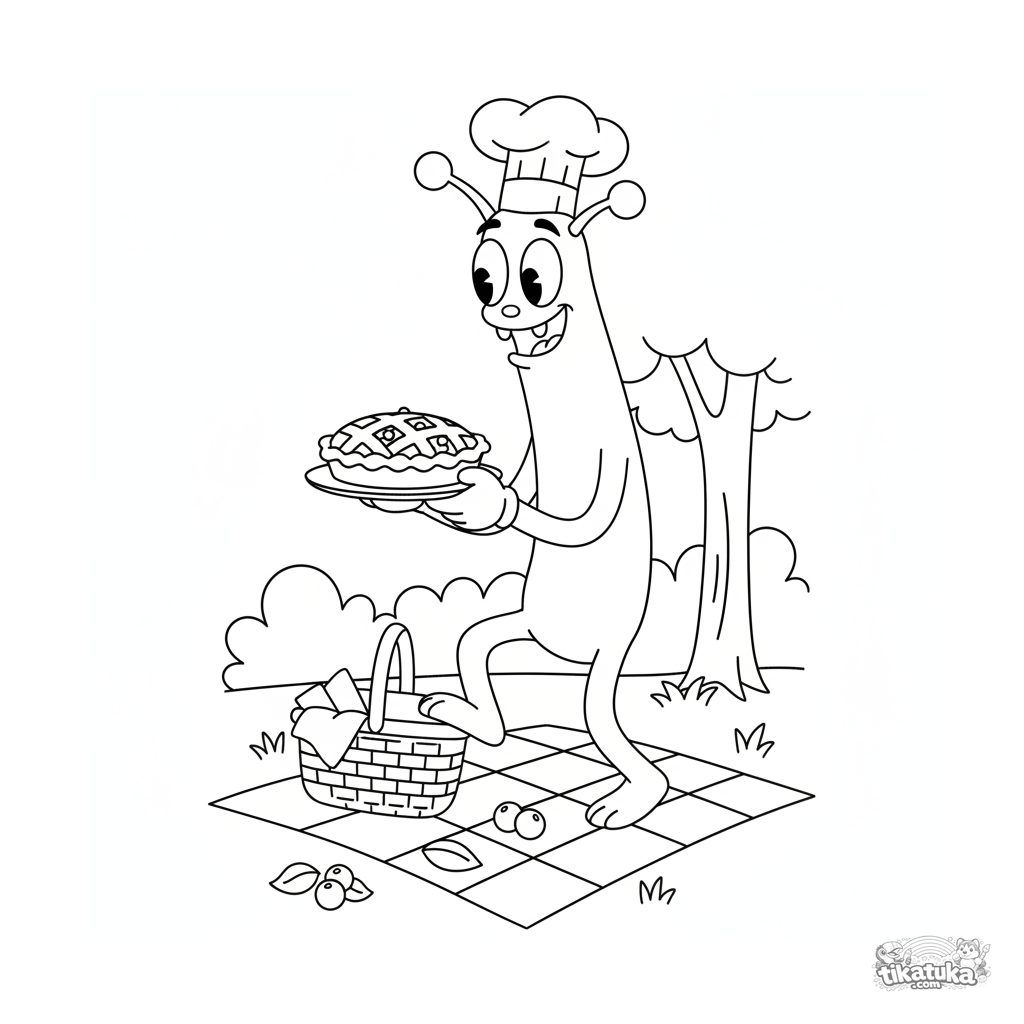Página para colorear para niños de 7-9 años: un monstruo largo en estilo de dibujos retro lleva una tarta en un picnic.