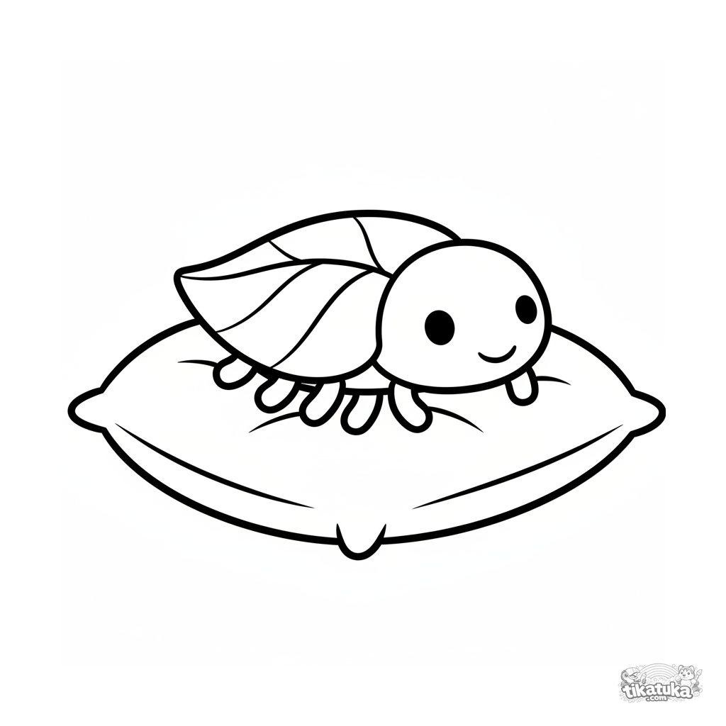 Página para colorear para los más pequeños: un bicho con forma de hoja duerme en una almohada. Dibujo minimalista con líneas suaves para niños de 2-3 años.