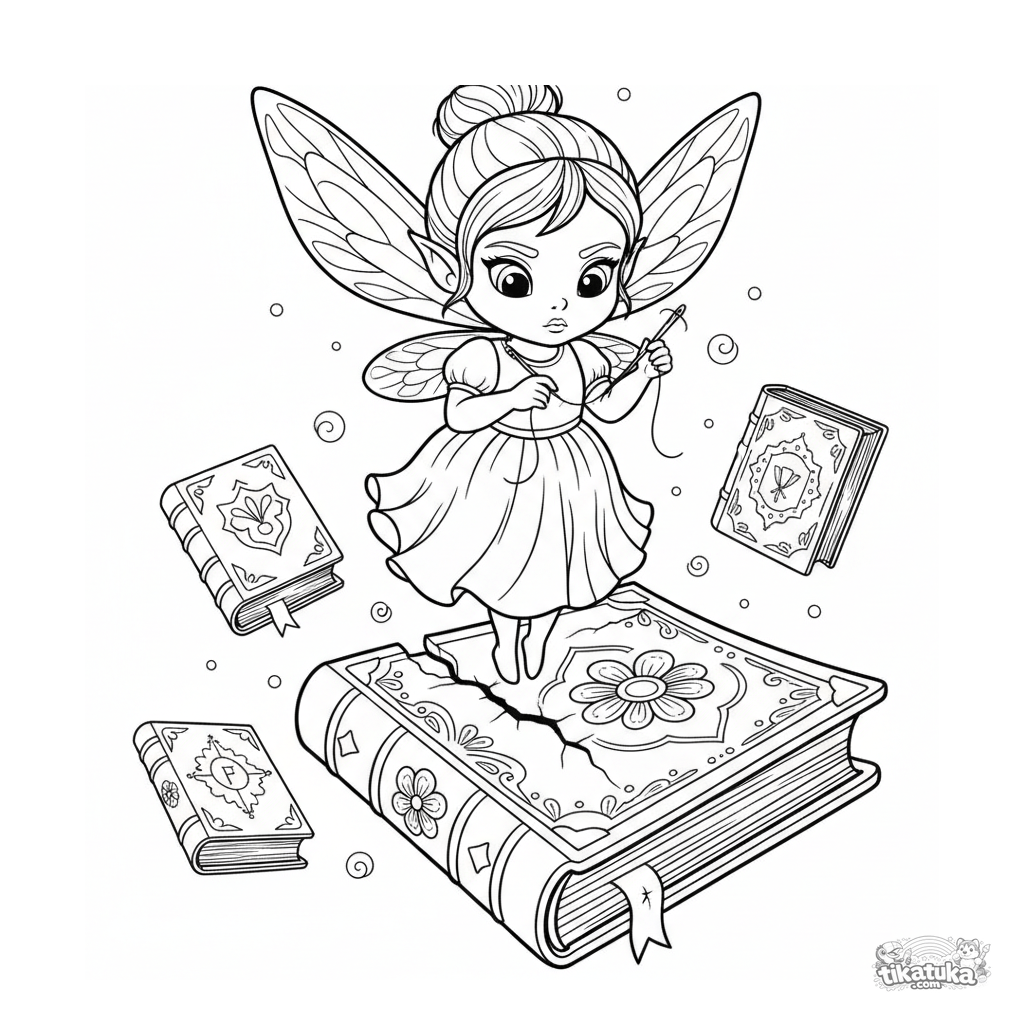 Página intrincada para colorear para niños 10-12: un hada bibliotecaria diminuta repara una página rota en un tomo mágico antiguo. Escena detallada.