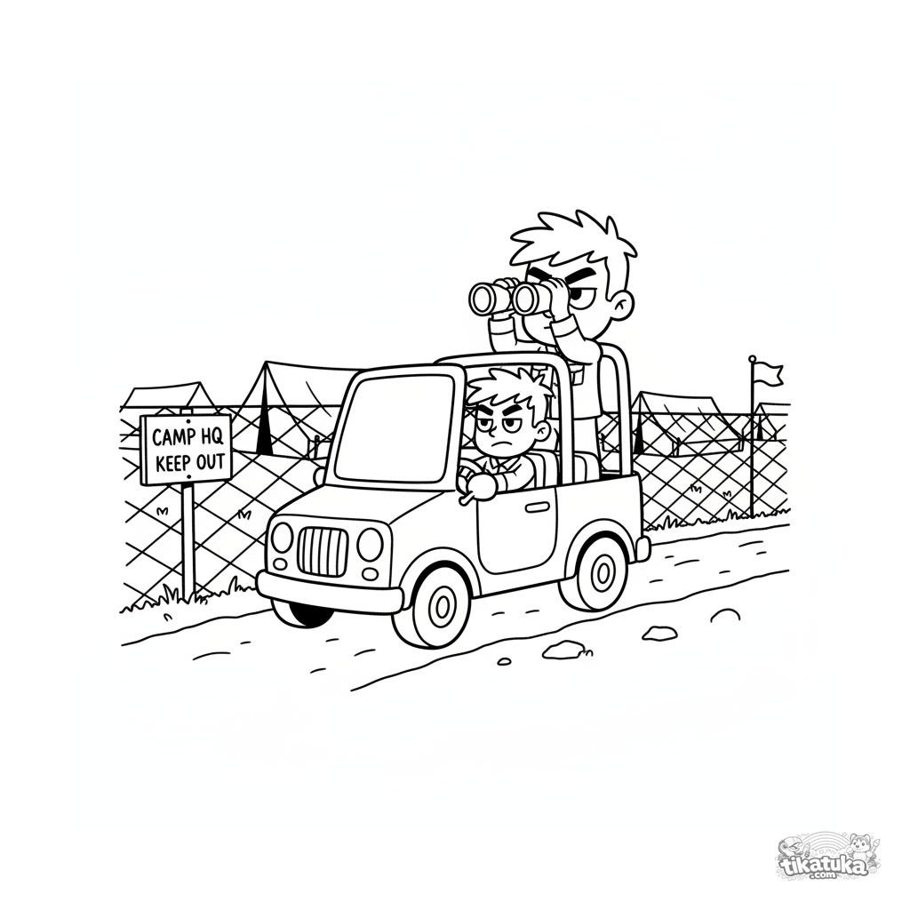Página para colorear para 7-9 años: un vehículo militar ligero patrulla el perímetro de un campamento de cuartel general de campo. Un soldado dentro escanea con prismáticos.